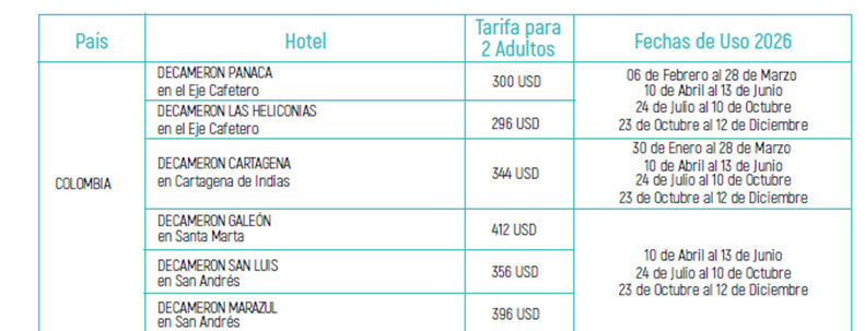 • La utilización es para las temporadas establecidas en las fechas del cuadro establecido (noches de viernes, y sábados no incluye festivos). No incluye semanas de receso escolar (Colombia, Perú y Panamá), primer quimestre del año