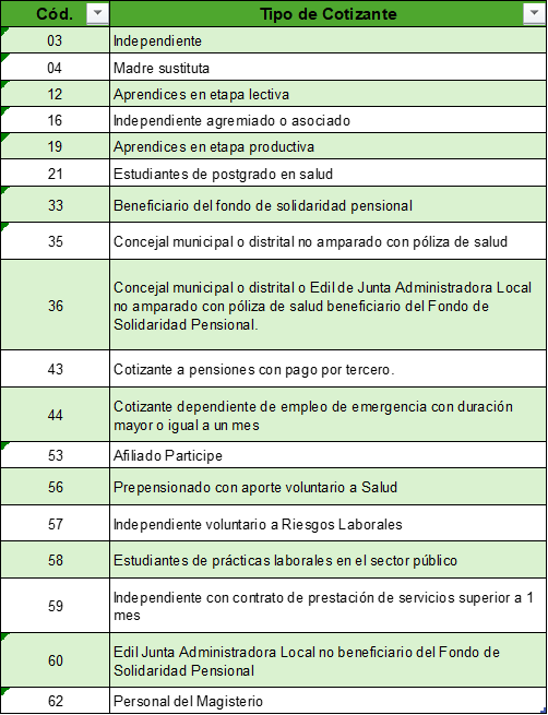 3. Se habilita el reporte de la novedad de IGE en L “Incapacidad temporal por enfermedad general o Licencia por cuidado de la niñez” para 18 nuevos tipos de cotizante, los cuales relacionamos a continuación: